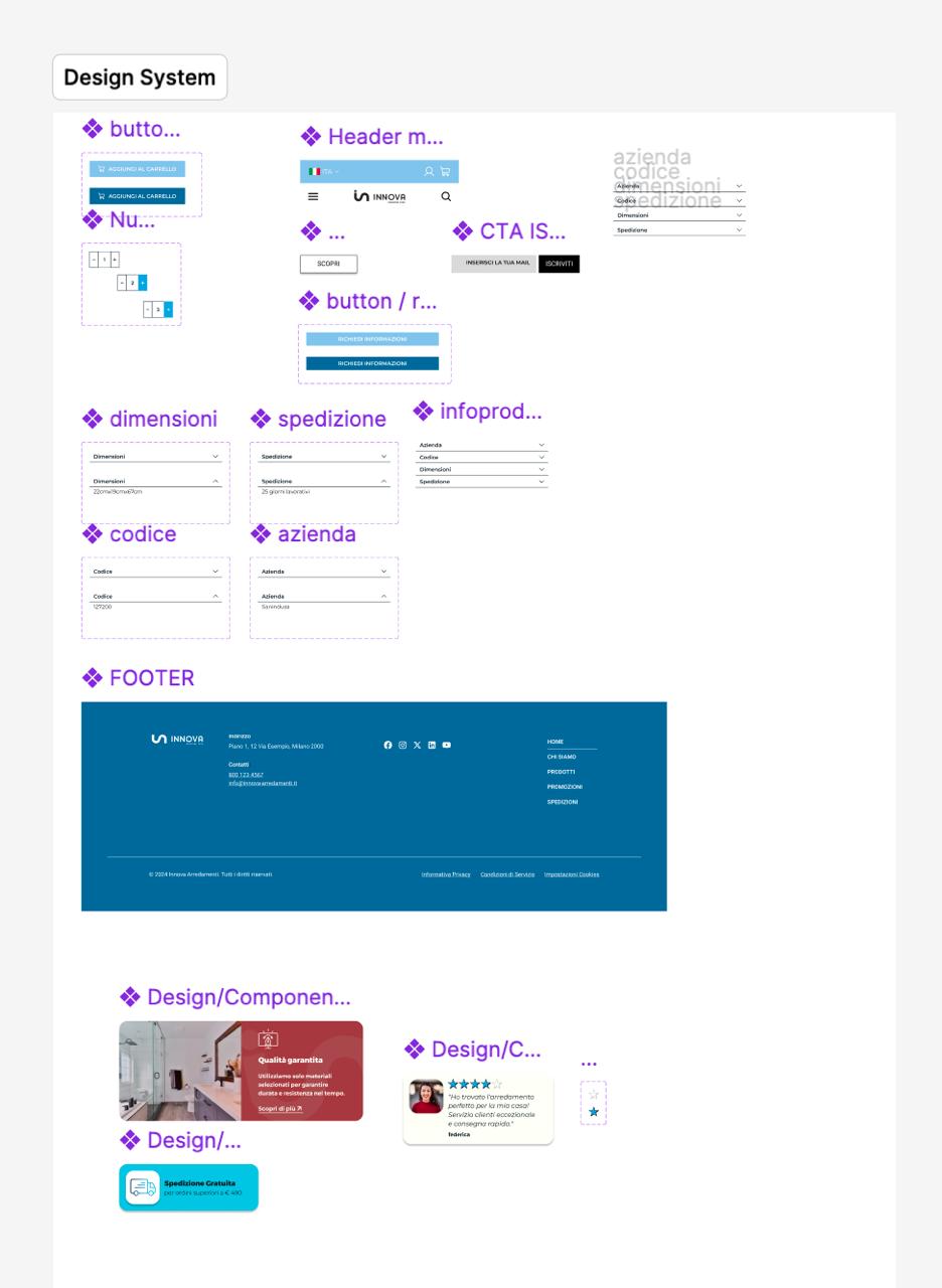 Una pagina di Figma dedicata al design system, che raccoglie e organizza tutti i componenti dell’interfaccia. Qui sono definiti elementi riutilizzabili, stili visivi e pattern funzionali, per garantire coerenza grafica, ordine progettuale e continuità nell’evoluzione del progetto.